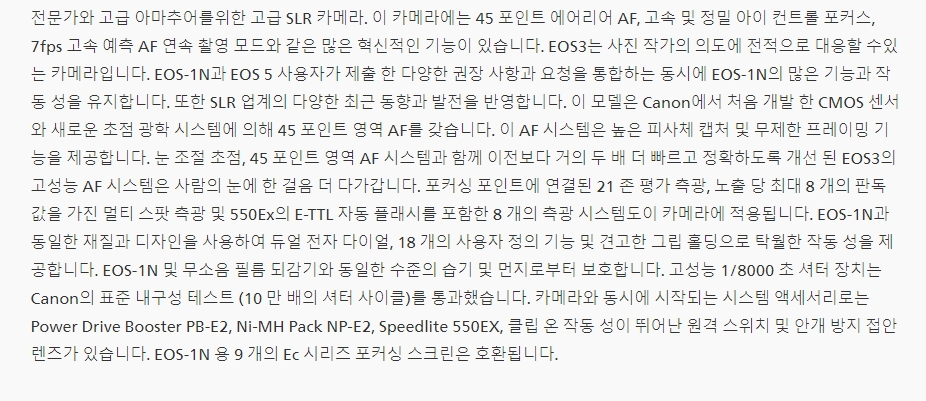 | 초점 | 45Point AF (TTL-CT-SIR) One shot AF AI Servo AF 수동 Eye controlled focus |