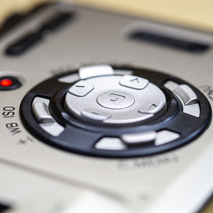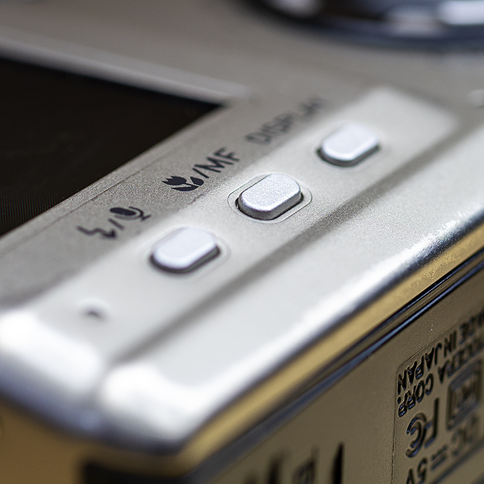 제품의 후면에는 카메라의 설정에 필요한 대부분의 버튼이 배치되어 있습니다. 메인 전원 버튼이나 매크로, 플래쉬 모드 버튼 등은 비교적 평이한 편이나 4방향 버튼과 원터치 버튼이 절묘하게 혼합된 메뉴 컨트롤 버튼은 제품의 디자인을 깔끔하게 하면서도 빠른 조작에도 도움을 주고 있어 높은 점수를 줄 수 있겠습니다.