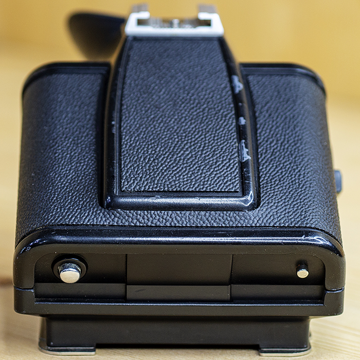 Victor Hasselblad AB는 정확한 잡지 취급을 돕기 위해 많은 노력을 기울였습니다. 필름 매거진에 어두운 슬라이드가 있으면 셔터가 열리지 못하지만 뒷면은 제거 할 수 있습니다. 반면에 뒷면은 어두운 슬라이드없이 몸에 고정되어 있습니다. 장소. 또한 서로 반대편에있는 두 개의 작은 표시창 – 뒤쪽에 하나, 신체에 다른 쪽 -은 필름 (노출되지 않은 노출 대 노출 된 상태)과 셔터 (굽히거나 대는 상태)의 상태를 보여줍니다.